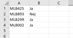 För att rapportera in dina uppgifter i e-tjänsten behöver du först förbereda en lista i ett kalkylark. Arket ska innehålla två kolumner:
